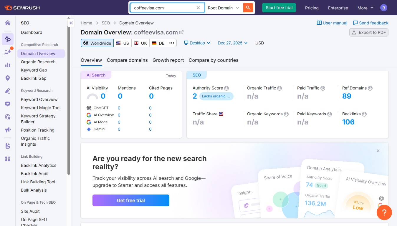 coffeevisa.com is a publication, news and Best Coffee Tips website. The site is built on a 18 years old domain, 106 Backlinks, and is indexed in Google & Domain Valued in $1,895 USD.